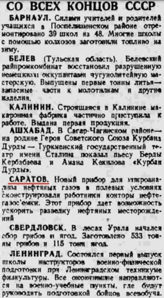 В сводном обзоре «Со всех концов СССР» 30 июля газеты «Правда» рассказывается о новой разработке в области нефтедобывающей промышленности: «<...>Саратов. Новый прибор для микроанализа нефтяных газов в полевых условиях сконструировали работники конторы нефтегазосъёмки. Этот прибор даёт возможность ускорить разведку нефтяных месторождений». [ 6 ]