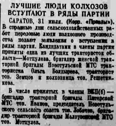 1 августа в заметке «Лучшие люди колхозов вступают в ряды партии» корреспондент газеты «Правда» публикует список передовиков сельскохозяйственного производства, подавших заявления о вступлении в ряды партии. Ниже приводятся списки принятых в ряды партии и списки принятых в кандидаты в члены партии. [ 9 ]