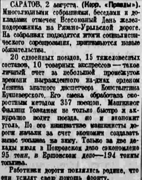 3 августа в газете «Правда» (№ 215 (8986)) в публикации «Всесоюзный День железнодорожника ознаменован производственным подъёмом на транспорте. Усиливают помощь фронту. Саратов» говорится о многочисленных собраниях, беседах, докладах, которыми отмечен Всесоюзный День Железнодорожника. «<...> На собраниях подводятся итоги социалистического соревнования, принимаются новые дополнительные обязательства».[ 10 ]