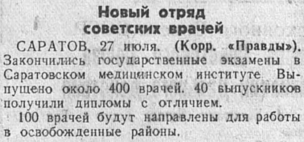 В заметке «Правды» «Новый отряд советских врачей» от 28 июля корреспондент газеты информирует о том, что в Саратовском медицинском институте закончились экзамены. «<...>Выпущено около 400 врачей. 40 выпускников получили дипломы с отличием. 100 врачей будут направлены в освобождённые районы». [ 11 ]