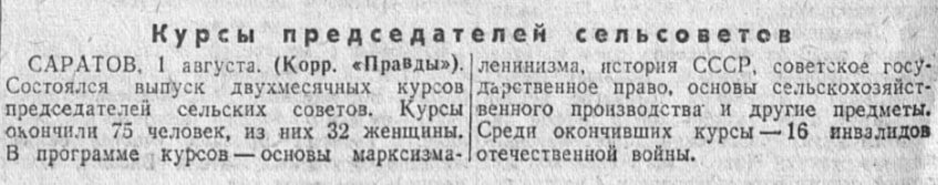 Публикация «Курсы председателей сельсоветов» («Правда» 2 августа (№ 192 (9328)) рассказывает о том, что состоялся выпуск двухмесячных курсов председателей сельских советов. Данные курсы закончили 75 человек, из них 32 женщины, 16 инвалидов отечественной войны. [ 20 ]