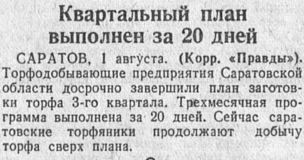 Квартальный план выполнен за 20 дней, сообщается в одноимённой заметке газеты «Правда» от 2 августа (№ 192 (9328)). «<...>Торфодобывающие предприятия Саратовской области досрочно завершили план заготовки топлива 3-го квартала. Трёхмесячная программа выполнена за 20 дней». [ 21 ]