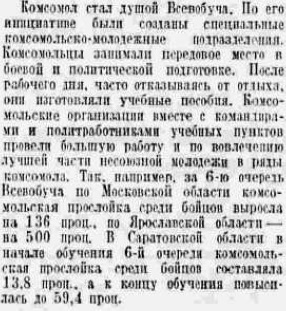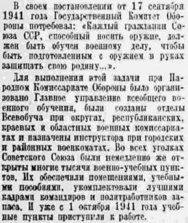 17 сентября 1941 года Государственный Комитет Обороны принял постановление о всеобщем обязательном обучении военному делу граждан СССР. Начальник Главного управления всеобщего военного обучения НКО СССР генерал - майор Н. Пронин в статье «Всевобуч в Отечественной войне» («Известия» от 17 сентября 1944 года) рассказывает об организации обучения [23].