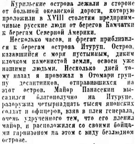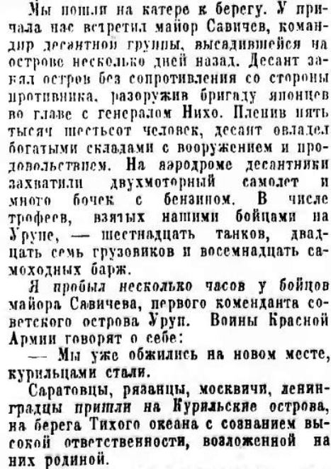 В газете «Известия» от 19 сентября 1945 года специальный корреспондент И. Осипов в статье «На Курильских островах» описывает переход на фрегате «Четвёрка» между портом Отомари (Корсаков, о.Сахалин) и Курильскими островами.