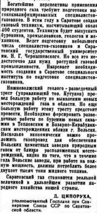 В этом номере опубликована и большая статья уполномоченного Госплана при Совнаркоме Союза ССР по Саратовской области - «Саратовский газ». Д. Ципоруха, перечисляя вклад саратовских месторождений газа в получение экономического эффекта в промышленности, указывает на дефицит квалифицированных кадров в газовой отрасли и необходимость подготовки их не только в газовом техникуме и Саратовском государственном университете им. Н. Г. Чернышевского, но и создании Института по подготовке газовиков. «Саратовский газ становится реальной величиной в дальнейшем развитии народного хозяйства нашей страны» - резюмирует он [30].