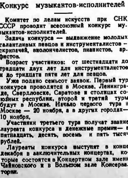Газета «Известия» от 11 октября извещает о том, что Комитет по делам искусств при СНК СССР проводит всесоюзный конкурс музыкантов-исполнителей. Задача конкурса — выдвижение молодых талантливых певцов и инструменталистов, скрипачей, виолончелистов, пианистов, арфистов. Уже подано семьсот заявок. Первый тур конкурса проводится в Москве, Ленинграде, Свердловске, Саратове и столицах союзных республик, второй и третий туры будут в Москве. Лауреаты конкурса выступят в конце декабря в заключительных концертах, которые состоятся в Концертном зале имени Чайковского и в Большом зале Консерватории [36].