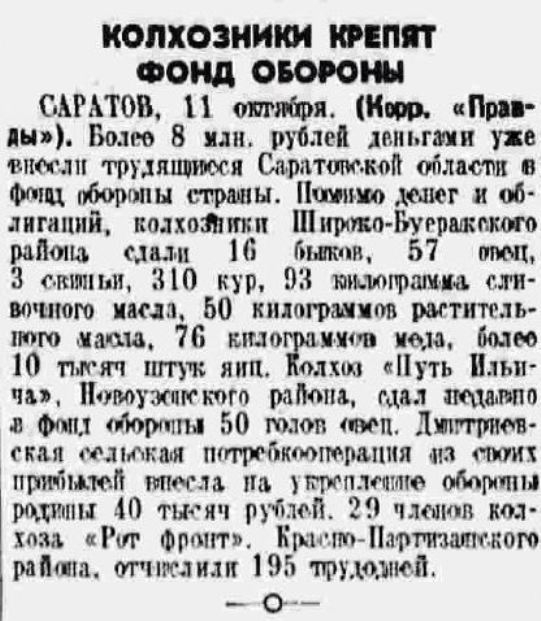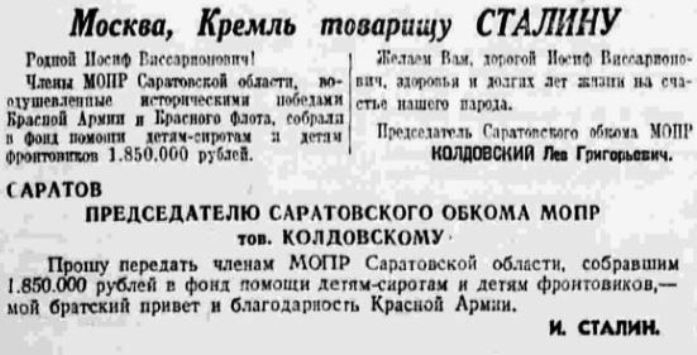 12 октября в газете «Правда» опубликовано письмо председателя Саратовского обкома МОПР тов. Колдовского И. В. Сталину и ответная благодарность Сталина членам МОПР Саратовской области, собравшим 1.850.000 рублей в фонд помощи детям-сиротам и детям фронтовиков [31, 32].