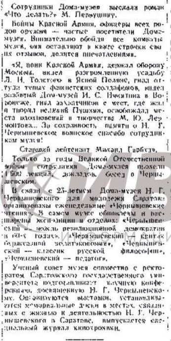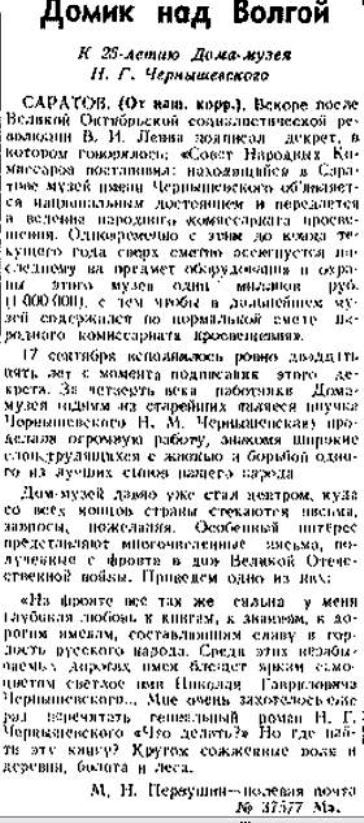 К 25-летию Дома-музея Н. Г. Чернышевского в «Литературной газете» от 6 октября опубликована статья «Домик над Волгой». Эта дата отсчитывается со дня подписания (17 сентября) В. И. Лениным декрета: «Совет Народных Комиссаров постановил: находящийся в Саратове музей имени Чернышевского объявляется национальным достоянием и передается в ведение народного комиссариата просвещения. Одновременно с этим до конца текущего года сверх сметы ассигнуется последнему на предмет оборудования и охраны этого музея один миллион руб. (1 000 000), с тем чтобы в дальнейшем музей содержался по нормальной смете народного комиссариата просвещения».