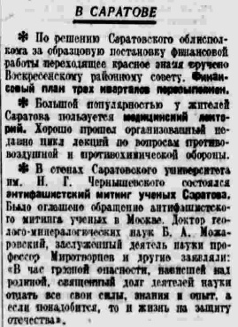 В газете «Правда» от 22 октября 1941 года на четвертой  странице в традиционном обзоре «Со всех концов СССР. В Саратове» рассказывается о том, что «в стенах Саратовского университета имени Н. Г. Чернышевского, состоялся, антифашистский митинг, в рамках которого выступили крупнейшие учёные Саратова. Они заявили: «В час грозной опасности, нависшей над родиной, священный долг деятелей науки отдать все свои силы, знания и опыт, а если понадобится, то и жизнь, на защиту отечества» (доктор геолого-минералогических наук, профессор Б. А. Можаровский, заслуженный деятель науки РСФСР, хирург С. Р. Миротворцев)». [1]