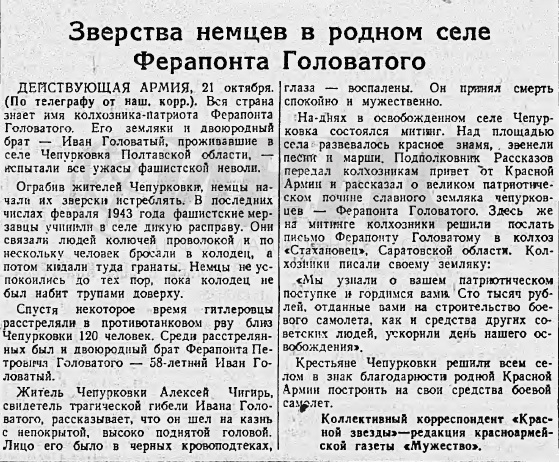 Коллективный корреспондент «Красной звезды» - редакция красноармейской газеты «Мужество» передавала в публикации «Зверства немцев в родном селе Ферапонта Головатого» - размещенной на страницах газеты «Красная звезда» 22 октября 1943 года на третьей странице. В публикации говорится о том, что родное село Ф. П. Головатого  - «село Чепурковка Полтавской области подверглось ограблению и истреблению её жителей немцами. Среди расстрелянных жителей оказался и двоюродный брат Ф. П. Головатого – 58-летний Иван. Очевидец трагической гибели  Ивана Головатого, житель Чепурковки, Алексей Чигирь, рассказывает «что он шёл на казнь с непокрытой, высоко поднятой головой. Лицо его было в чёрных кровоподтёках, глаза  - воспалены. Он принял смерть спокойно и мужественно». После освобождения села Красной Армией – «Крестьяне Чепурковки решили всем селом в знак благодарности родной Красной Армии построить на свои средства боевой самолёт» - отмечается в публикации. [14]