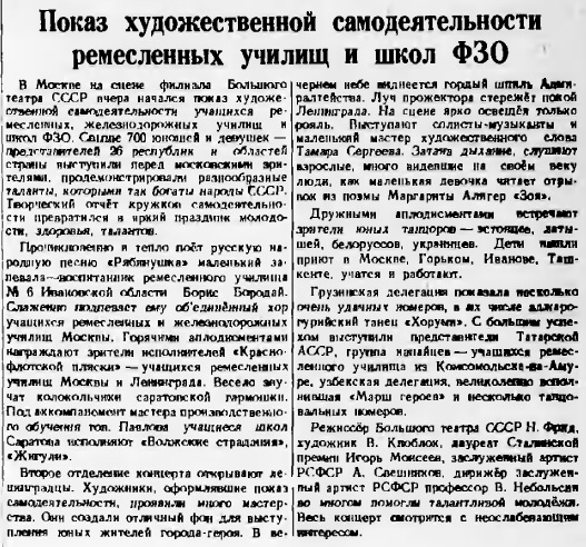 В большой публикации, рассказывается о показе художественной самодеятельности ремесленных училищ и школ ФЗО. Отмечается, что в смотре весело звучат колокольчики саратовской гармошки. Под аккомпанемент мастера производственного обучения тов. Павлова учащиеся школ Саратова исполняют «Волжские страдания», «Жигули» – отмечается в публикации. Публикация называется «Показ художественной самодеятельности ремесленных училищ и школ ФЗО» («Известия» 24 октября 1943 года). [16]