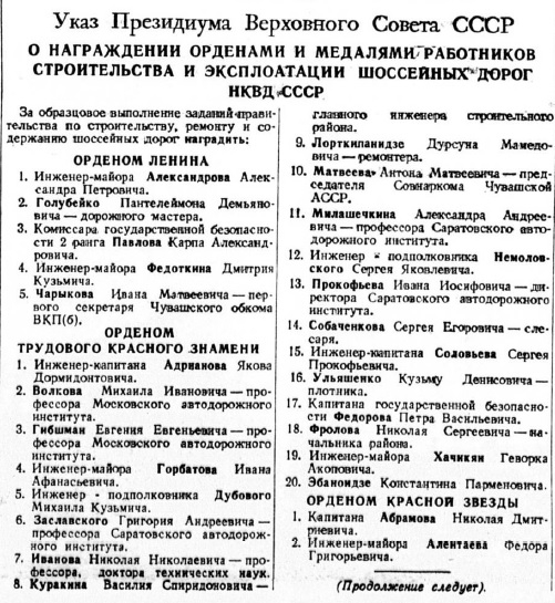 «Указ Президиума Верховного Совета СССР О награждении орденами и медалями работников строительства и эксплуатации шоссейных дорог НКВД СССР» был опубликован в газете «Известия» от 25 октября 1944 года на первой странице. За образцовое выполнение заданий правительства по строительству, ремонту и содержанию шоссейных дорог наградить: Орденом Трудового Красного Знамени профессоров и директора Саратовского автодорожного института: «Заславского Григория Андреевича, Милашечкина Александра Андреевича, Прокофьева Ивана Иосифовича». [20]