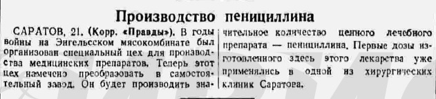 Заметка «Производство пенициллина» была опубликована в газете «Правда» 22 октября 1945 года на третьей странице. В ней рассказывается, о том, что «в годы войны на Энгельсском мясокомбинате был организован специальный цех по производству медицинских препаратов. Цех намеревается преобразовать в завод, который будет производить пенициллин – ценный лечебный препарат в значительных количествах, первые партии лекарства уже применялись в одной из хирургических клиник города Саратова» – отмечается корреспондентом в своей заметке. [28]