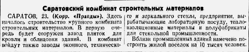 В газете «Правда» 24 октября 1945 года на третьей странице вышла заметка под заголовком «Саратовский комбинат строительных материалов». Корреспондент рассказывает: «В Саратове началось строительство крупного комбината строительных материалов. Автор газетного материала сообщает, «что вблизи промышленных зданий намечено построить жилой поселок на 10 тысяч человек». [32]