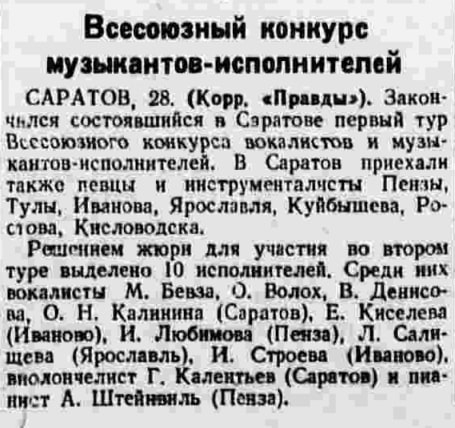 29 ноября в газете «Правда» публикация «Всесоюзный конкурс музыкантов-исполнителей» информирует о состоявшемся в Саратове первом туре Всесоюзного конкурса вокалистов и музыкантов-исполнителей. «<...> В Саратов приехали также певцы и инструменталисты Пензы, Тулы, Иванова, Ярославля, Куйбышева, Ростова, Кисловодска». Корреспондент отмечает, что по решению жюри во второй тур были отобраны 10 участников, в том числе и саратовские исполнители: вокалисты М. Бевза, О. Волох, В. Денисова, О. Н. Калинина [32].