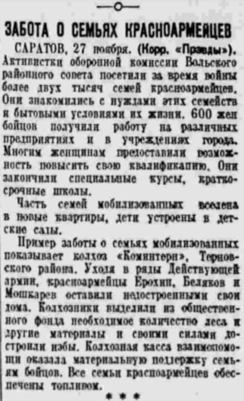 28 ноября в газете «Правда» опубликован материал «Забота о семьях красноармейцев» о работе активисток оборонной комиссии Вольского районного совета. Отмечено, что за время войны активистки совета посетили более двух тысяч семей красноармейцев: жёнам красноармейцев помогли с трудоустройством и повышением квалификации; часть семей мобилизованных вселили в новые квартиры; помогли с устройством детей в детские сады. «<...> Пример заботы о красноармейцах показывает колхоз «Коминтерн», Терновского района… Колхозная касса взаимопомощи оказала материальную поддержку семьям бойцов. Все семьи красноармейцев обеспечены топливом» [6].