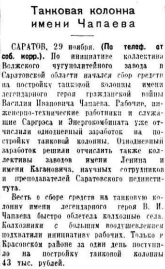 В публикации «Танковая колонна имени Чапаева» («Известия», 30 ноября) рассказывается о том, что «<...> по инициативе коллектива Волжского чугунолитейного завода в Саратовской области начался сбор средств на постройку танковой колоны имени легендарного героя гражданской войны Василия Ивановича Чапаева… Колхозники с большим воодушевлением подхватили инициативу рабочих. Только в Красовском районе за один день поступило на постройку танковой колоны 43 тыс. рублей» [10].