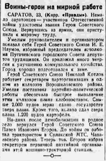 24 ноября в газете «Правда» заметка «Воины-герои на мирной работе» сообщает, что «<...> немало саратовцев – участников Великой отечественной войны были удостоены звания Героя Советского Союза. Вернувшись из армии, они приступили к мирному труду». Корреспондент в заметке подробно рассказывает о том, где и как нашли применение своим силам саратовцы, Герои Советского Союза: И. Е. Наумов, Николай Котлов, Павел Иванович Егоров [28].