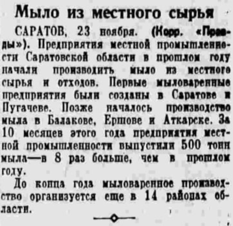 24 ноября в газете «Правда» заметка «Мыло из местного сырья» информирует, что предприятия местной промышленности приступили к производству мыла из местного сырья и отходов. «<...>Первые мыловаренные предприятия были созданы в Саратове и Пугачёве. Позже началось производство мыла в Балашове, Ершове и Аткарске». Отмечается, что до конца года планируется организовать мыловаренное производство ещё в 14 районах области [11].