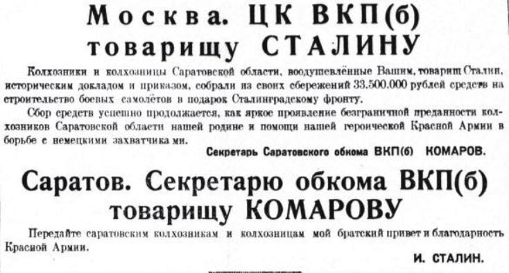 С 12 по 13 декабря центральная печать опубликовала ряд статей, писем Сталину отражающих вклад Саратовской области – колхозники и колхозницы Саратовской области собрали из своих сбережений 33.500.000 рублей средств на строительство боевых самолётов в подарок Сталинградскому фронту. И воюют на этих самолётах нередко бывшие колхозники. Один из самолётов, построенных на средства, собранные колхозниками артели «Сигнал революции», Ворошиловского района, Саратовской области, вручён защитнику Сталинграда Герою Советского Союза майору Шишкину, вчерашнему колхознику. Советская деревня даёт новое оружие в руки своим же сынам! [11-21].