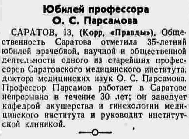 Общественность Саратова отмечает 35–летний юбилей научной деятельности профессора О. С. Парсамова [43].