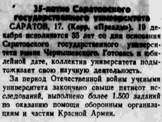 18 декабря в газете «Правда» (№ 303) публикация «35-летие Саратовского Государственного университета» сообщает читателям, что коллектив Саратовского государственного университета к юбилейной дате подытоживает свою научную деятельность. Отмечается, что «<...>за период Отечественной войны учёными университета закончено свыше пятисот исследований, выполнено более 1.500 заданий по оказанию помощи оборонным организациям и частям Красной Армии». [ 46 ]