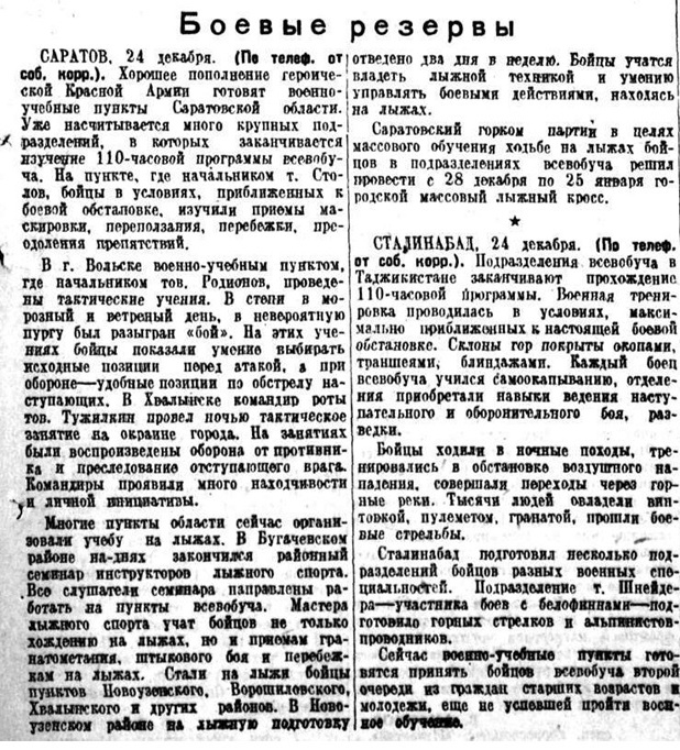 Газета «Известия» от 25 декабря 1941 года разместила на первой странице сообщение под заголовком «Боевые резервы. Саратов». Собственный корреспондент «Известий» информирует о хорошем пополнении героической Красной Армии, которое готовят военно-учебные пункты Саратовской области». В частности, отмечается в сообщении, что «в г. Вольске военно-учебным пунктом проведены тактические учения, в г. Хвалынске было проведено ночное занятие по тактике боя. Корреспондентом отмечается организация лыжной подготовки бойцов. В Пугачёвском районе закончился районный семинар инструкторов лыжного спорта. Встали на лыжи бойцы пунктов Новоузенского, Ворошиловского, Хвалынского и других районов области. Саратовский горком партии в целях массового обучения ходьбе на лыжах бойцов в подразделениях всевобуча решил провести с 28 декабря по 25 января городской массовый лыжный кросс». [5]