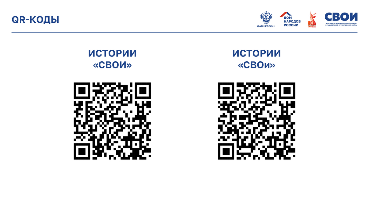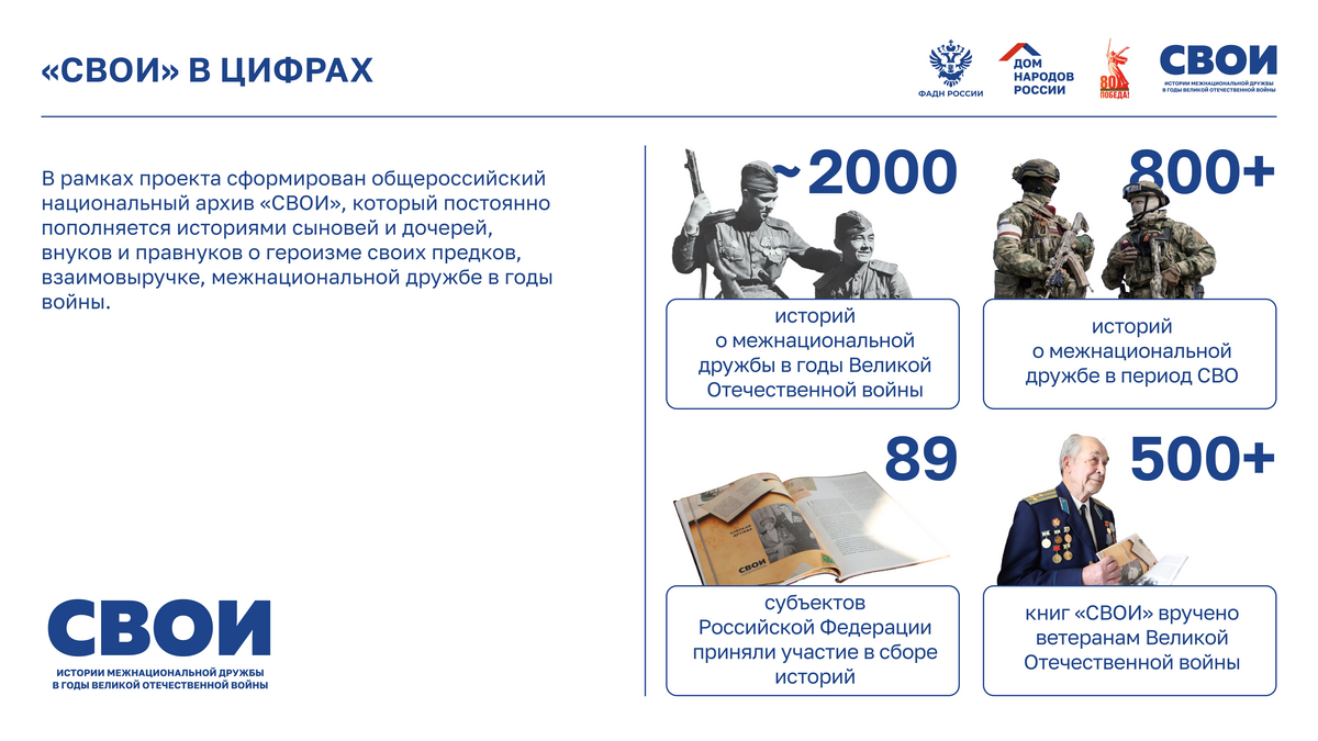 В 2025 году в рамках проекта будет издана книга «СВОИ», в которую войдут 80 самых интересных историй. В Год защитника Отечества одна из глав книги будет посвящена историям потомков победителей. Тем, кто сегодня в зоне СВО продолжают дело дедов и прадедов. Проект «СВОИ» реализуется также в формате интерактивных выставок. В этом году выставки о межнациональной дружбе в годы Великой Отечественной войны и в период СВО откроются по всей России.
