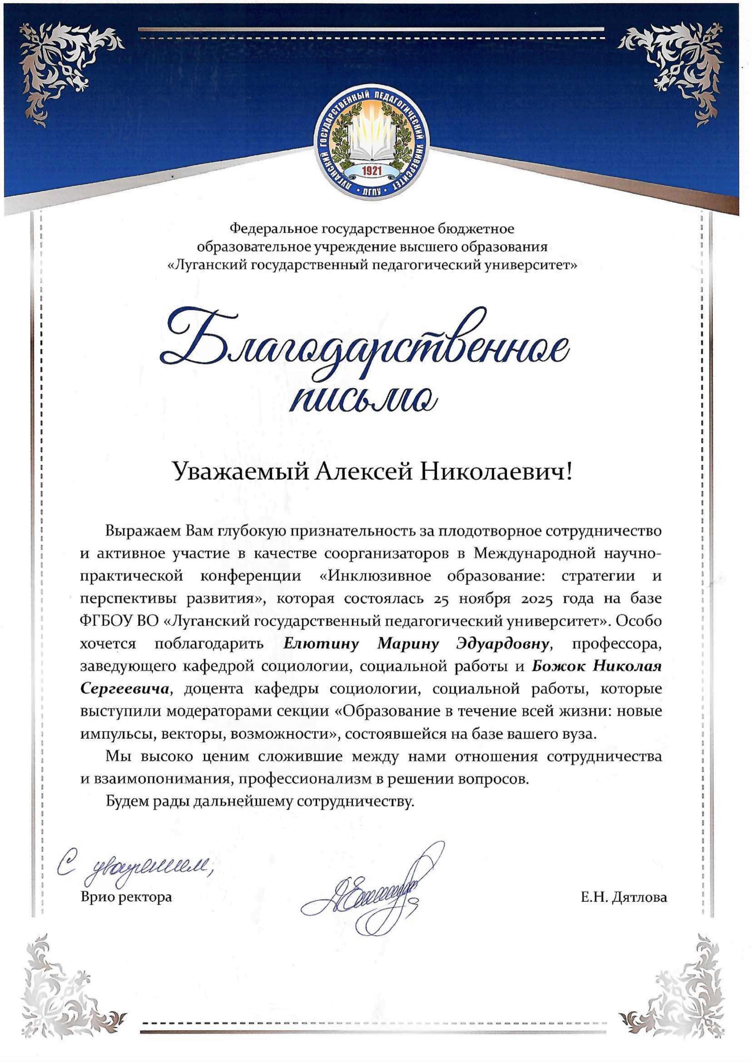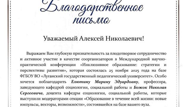 По итогам конференции руководство Луганского государственного педагогического университета направило благодарственное письмо ректору Саратовского классического университета Алексею Николаевичу Чумаченко за плодотворное сотрудничество и активное участие в качестве соорганизаторов конференции. Врио ректора ЛГПУ Елена Николаевна Дятлова в письме отметила высокий уровень профессионализма и успешного партнёрства между высшими образовательными организациями, а также особо поблагодарила профессора, заведующего кафедрой социологии социальной работы Марину Эдуардовну Елютину и доцента кафедры социологии социальной работы Николая Сергеевича Божка за организацию секции «Образование в течение всей жизни: новые импульсы, векторы, возможности».