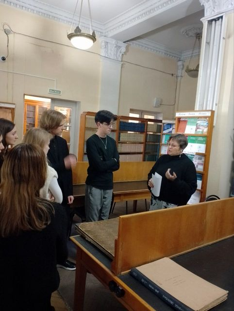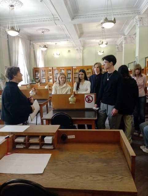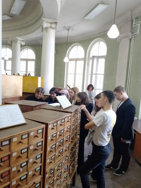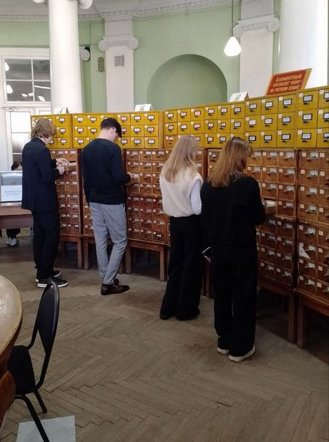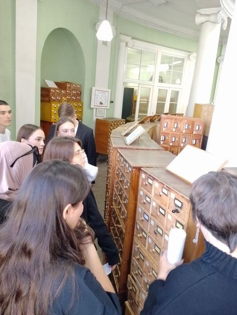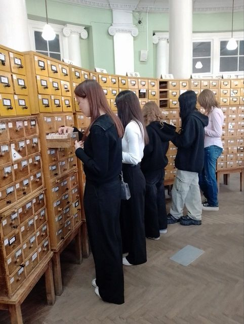 Во второй части экскурсии студенты познакомились с общими правилами пользования библиотекой, организацией карточных каталогов (алфавитных, систематического), системой поиска и заказа книги. Отдельный этап экскурсии был посвящён электронным каталогам и базам.