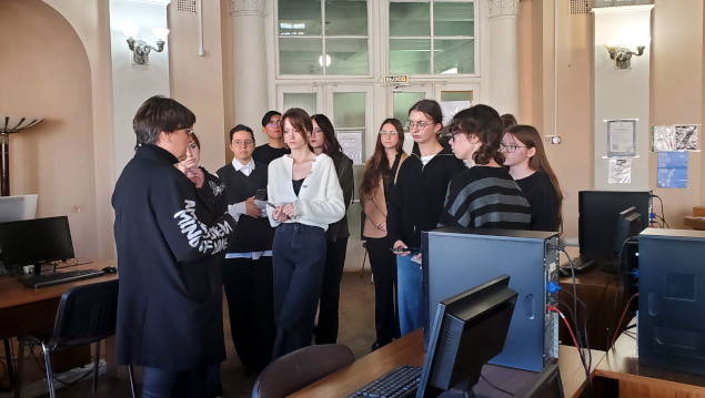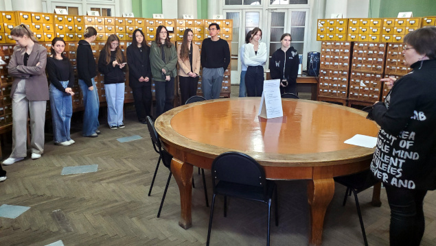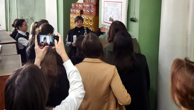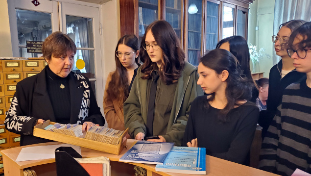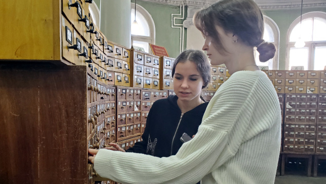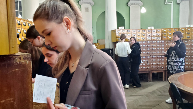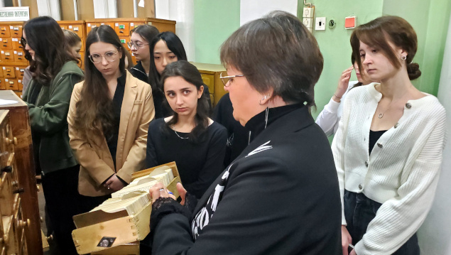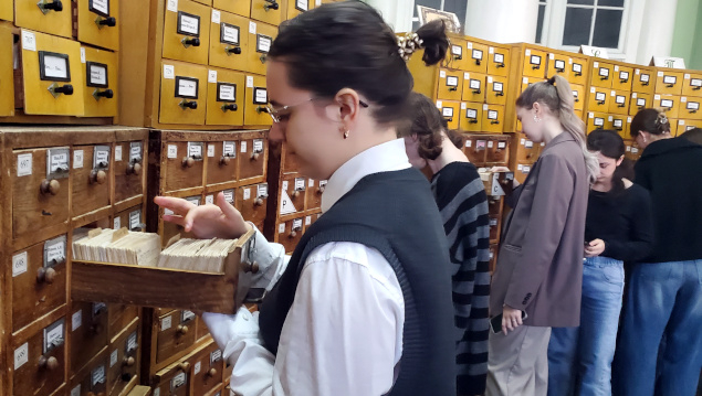 Во второй части экскурсии студенты познакомились с общими правилами пользования библиотекой, организацией карточных каталогов (алфавитных, систематического), системой поиска и заказа книги. Отдельный этап экскурсии был посвящён электронным каталогам и базам.