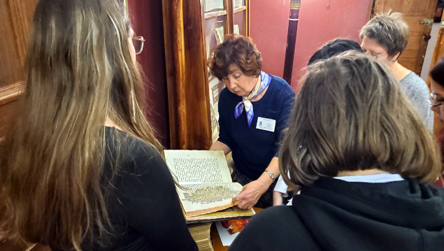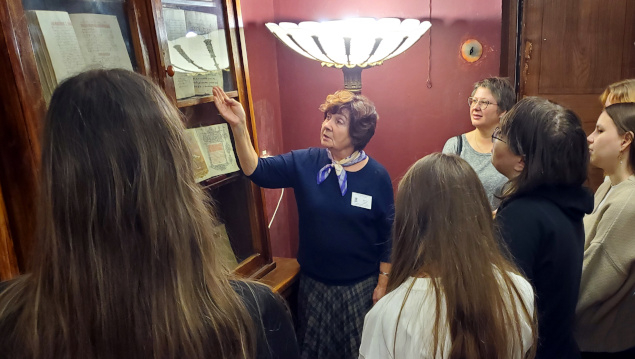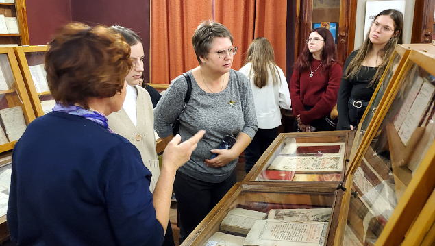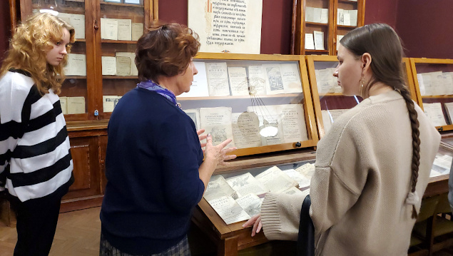 На выставке по истории русской книги студенты узнали об особенностях рукописных и старопечатных изданий, о журналах екатерининского, петровского времени и Серебряного века, увидели издания с автографами, познакомились с особенностями формирования фонда отдела редких книг и рукописей, услышали о коллекционерах-дарителях.