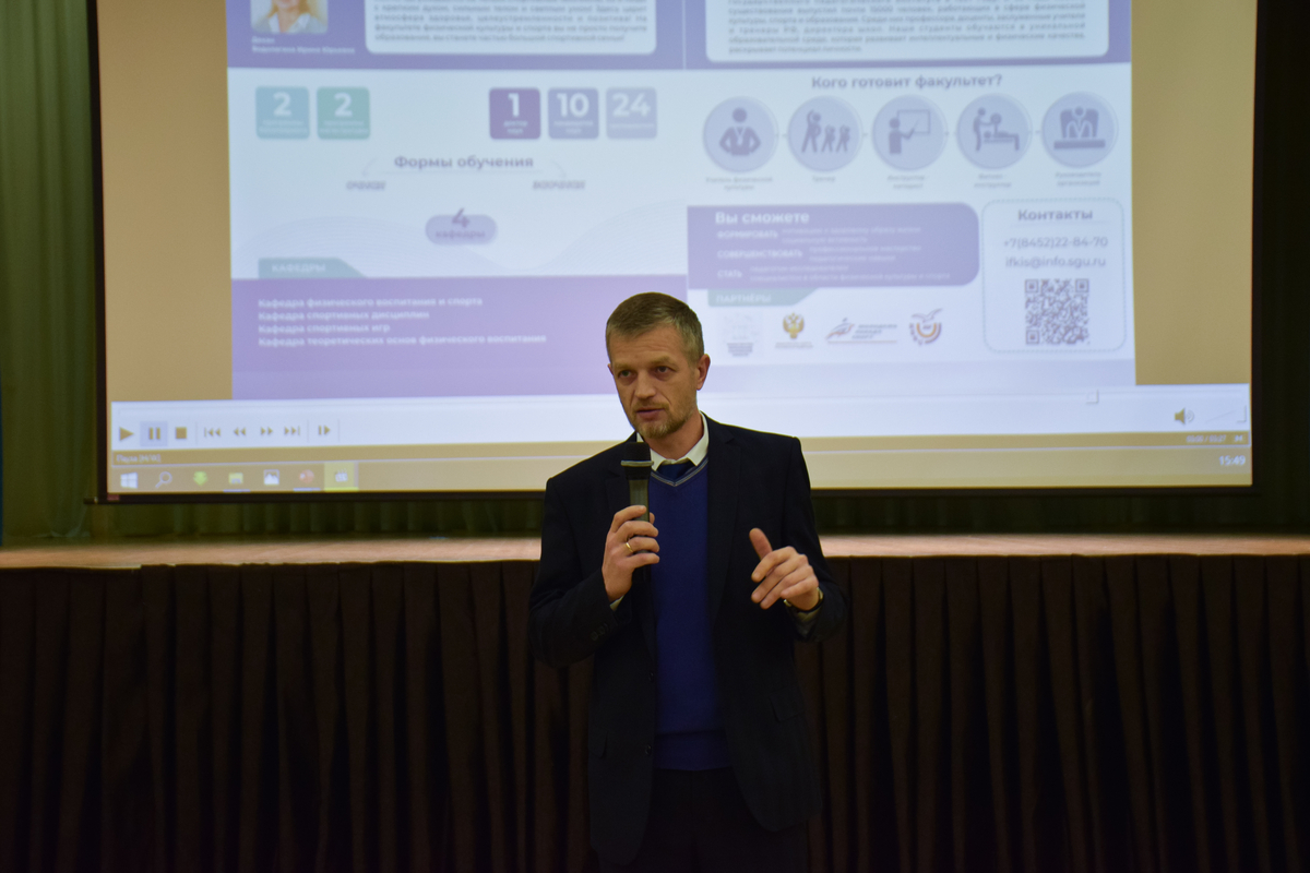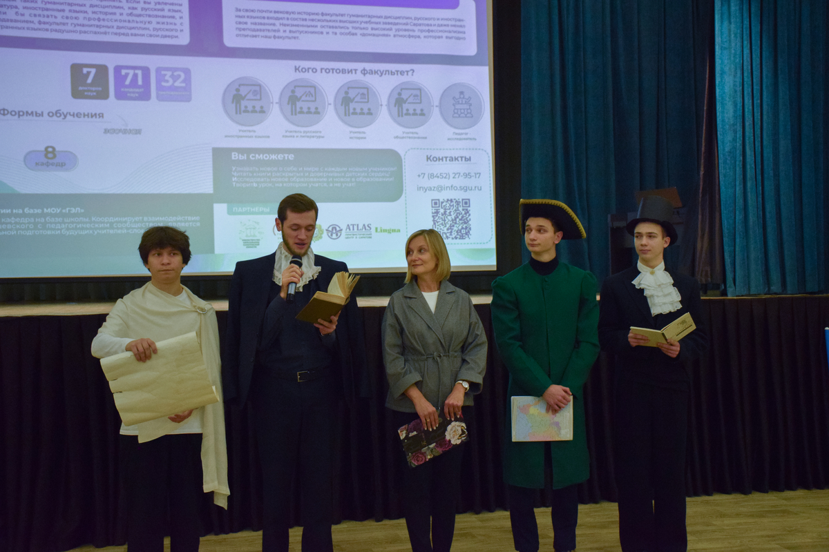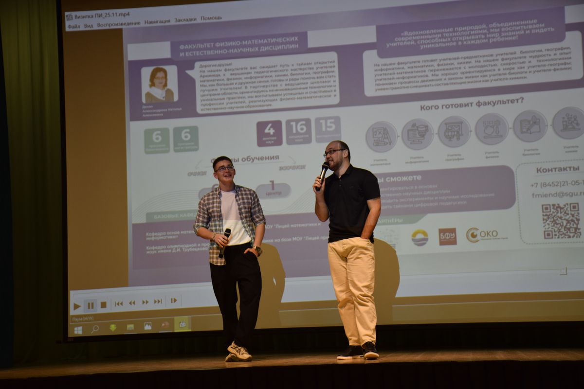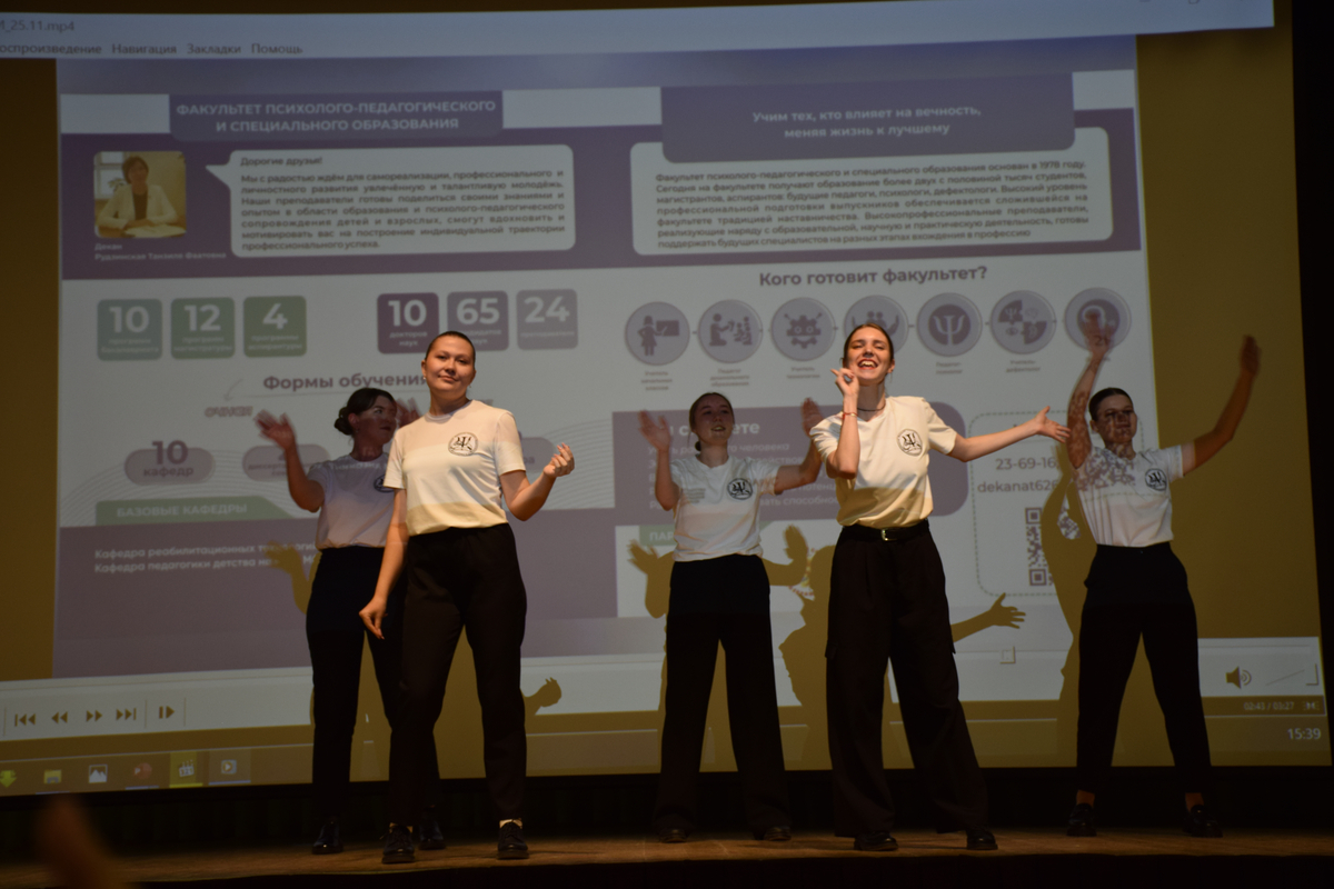 С приветственным словом к участникам обратилась директор Педагогического института СГУ Т. Г. Фирсова. Интерактивное путешествие по 5 факультетам Педагогического института позволило представить всю его профильную многогранность и вместе с тем целостное единство в деле подготовки педагога. Факультет гуманитарных дисциплин, русского и иностранных языков представила и.о. декана М. А. Исайкина и творческая команда студентов, персонифицировав роли древнегреческого философа, Петра I, А. С.Пушкина, В. Шекспира. Ответственная за учебную работу С.В. Кузьмина и шуточная кукольная постановка рассказали о факультете искусств. Загадками от «трёх сестёр» - педагогики, психологии и дефектологии, а также искусством жестового пения покорил факультет психолого-педагогического и специального образования и ответственная за научную работу О. В. Кощеева. Студенческий стендап и ответственная за научную работу Т. В. Иншина раскрыли специфику факультета физико-математических и естественно-научных дисциплин. Заведующий кафедрой спортивных игр Р. С. Данилов и выступление студентов факультета физической культуры и спорта показали красоту спортивных дисциплин: гимнастики, лёгкой атлетики, хоккея, и раскрыли секрет пути от массового спорта к спорту высоких достижений.