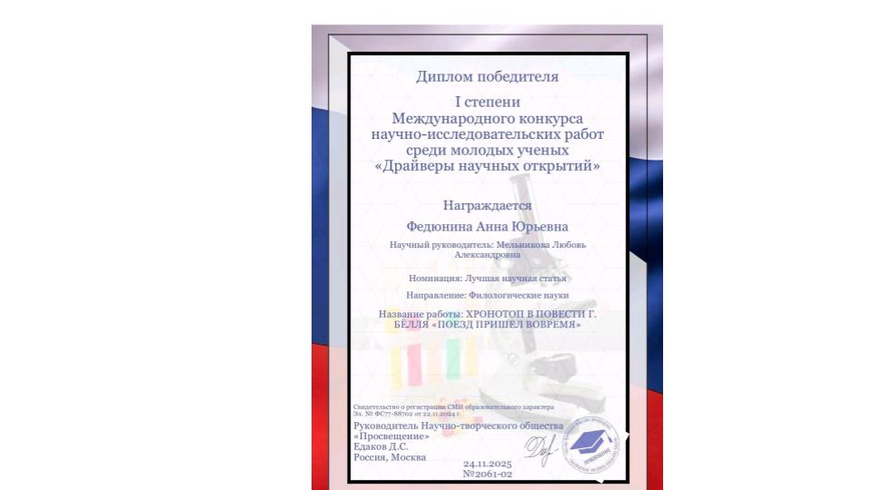 Подведены итоги Международного конкурса научно-исследовательских работ среди молодых ученых «Драйверы научных открытий», проходившего в октябре-ноябре 2025 года в г. Москве под эгидой научно-творческого общества «Просвещение». На конкурс было продано около 100 работ из различных регионов России. По его итогам в номинации «Лучшая научная статья» работа студентки 3 курса профилей «Русский язык. Литература» Анны Федюниной на тему «Хронотоп в повести Г. Бëлля «Поезд пришел вовремя» (научный руководитель – доцент кафедры филологических дисциплин Л. А. Мельникова) отмечена дипломом I степени.