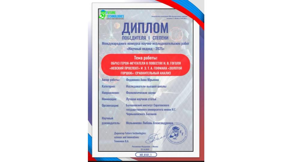 В категории «Исследователи высшей школы» по направлению «Филологические науки» в номинации «Лучшая научная статья» дипломом I степени отмечена работа студентки 3 курса профилей «Русский язык. Литература» Анны Федюниной на тему «Образ героя-мечтателя в повестях Н. В. Гоголя «Невский проспект» и Э. Т. А. Гофмана «Золотой горшок»: сравнительный анализ» (научный руководитель – доцент кафедры филологических дисциплин Л.А. Мельникова). В данном исследовании посредством использования сравнительно-исторического метода рассматриваются способы и приемы раскрытия образов героев-мечтателей, представленных в повестях Н.В. Гоголя «Невский проспект» и Э.Т.А. Гофмана «Золотой горшок» – Пискарева и Ансельма, выявляются сходства и различия в художественных подходах русского и немецкого писателей к интерпретации героя-мечтателя и его роли в мире. Если Н.В. Гоголь показывает трагическую несовместимость возвышенных идеалов и прозаической действительности, то Э. Т. А. Гофман на примере своего персонажа демонстрирует возможность гармоничного синтеза мечты и яви, обретения счастья через веру в собственные силы и принятие иррационального.