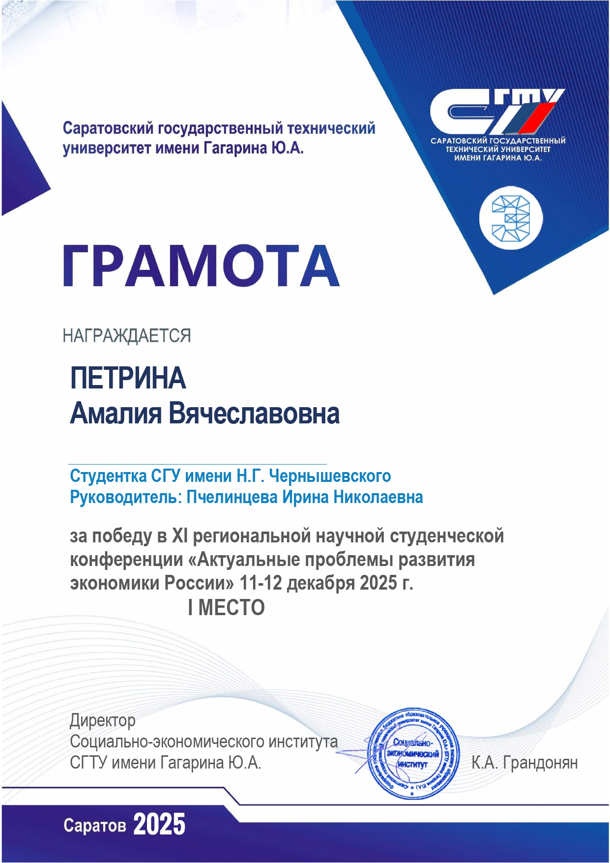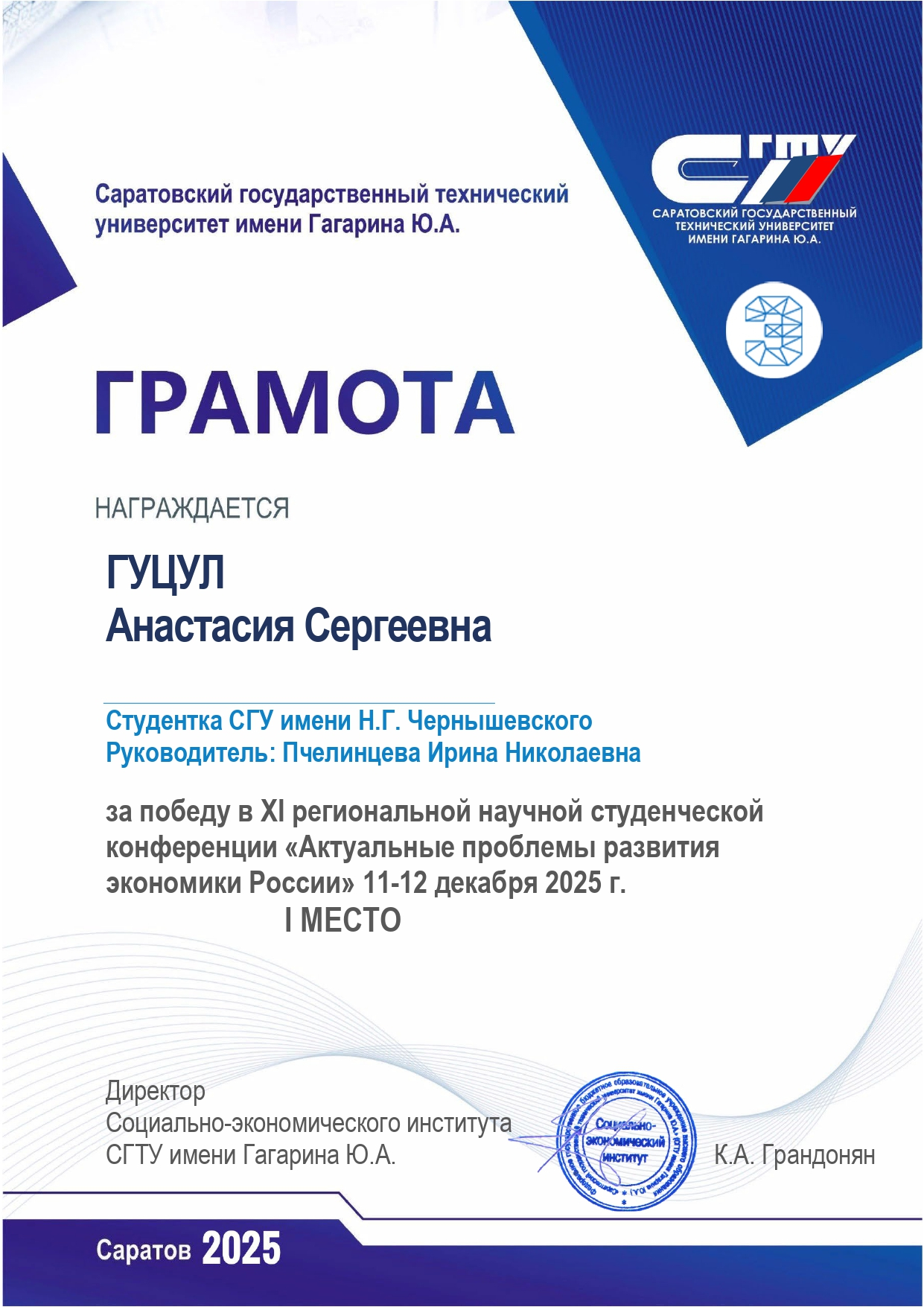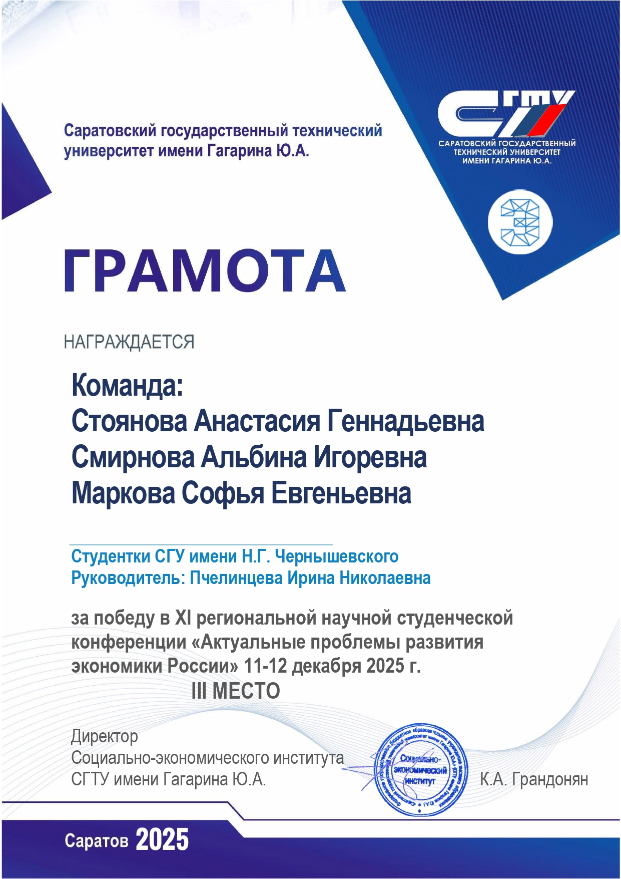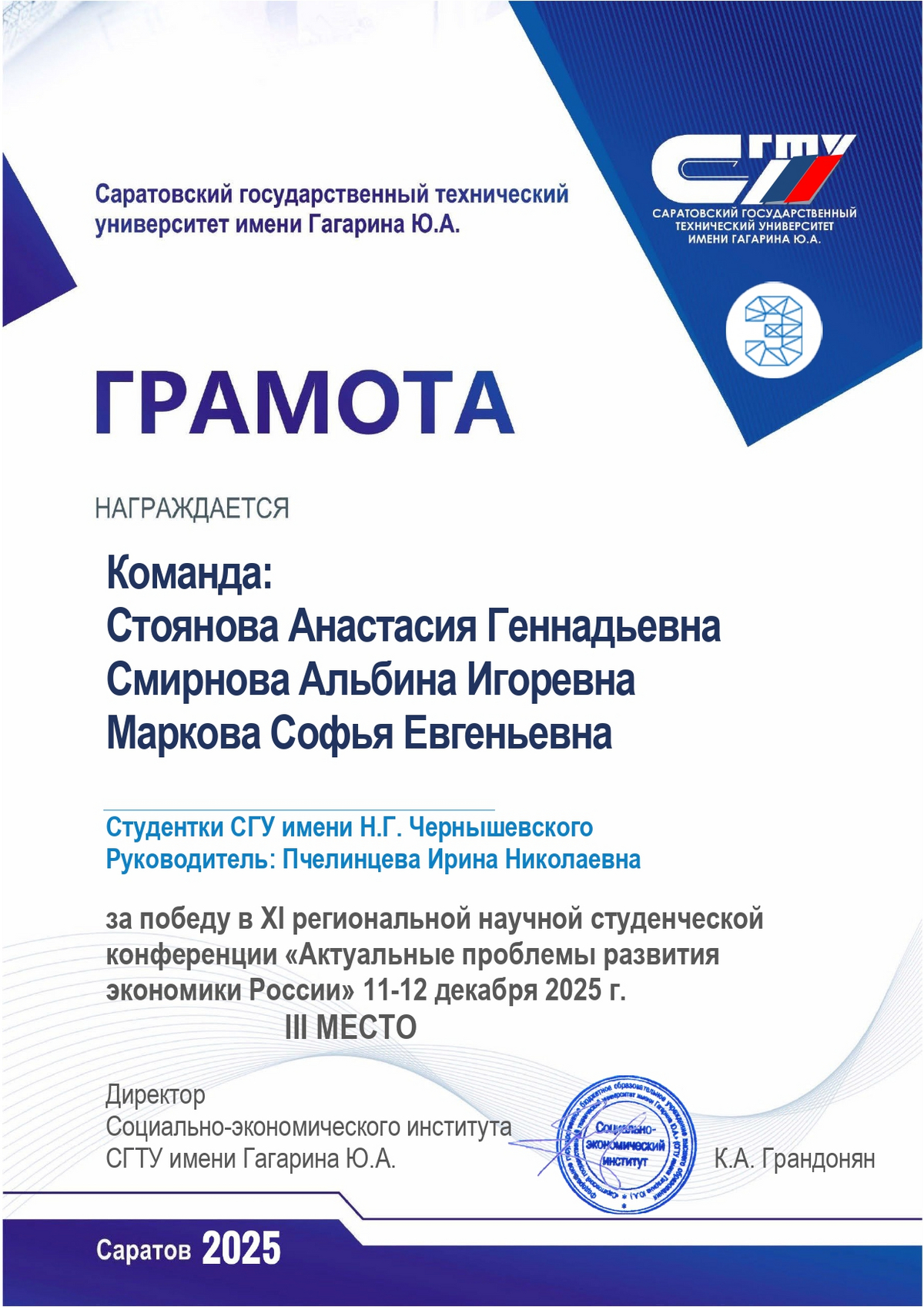 С 11 по 12 декабря 2025 года в Саратовском государственном техническом университете имени Гагарина Ю.А. прошла XI Региональной научной студенческой конференции «Актуальные проблемы развития экономики России», в ходе которой обсуждались различные социально-экономические аспекты развития нашей страны . На конференции с докладами в пленарном заседании и секциях: «Устойчивое развитие экономики в условиях глобальных вызовов», «Глобальные и региональные тенденции развития экономики в условиях цифровой трансформации», «Цифровая экономики: угрозы, риски и возможности», «Тенденции развития предпринимательства в России» выступили студенты 1 и 4 курсов бакалавриата направления подготовки 38.03.02 Менеджмент, научный руководитель проф. Пчелинцева И.Н. Все доклады студентов были отмечены Грамотами.