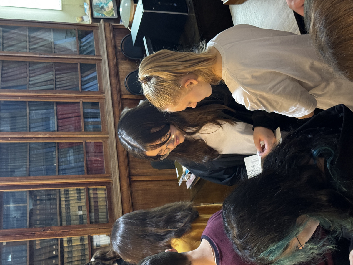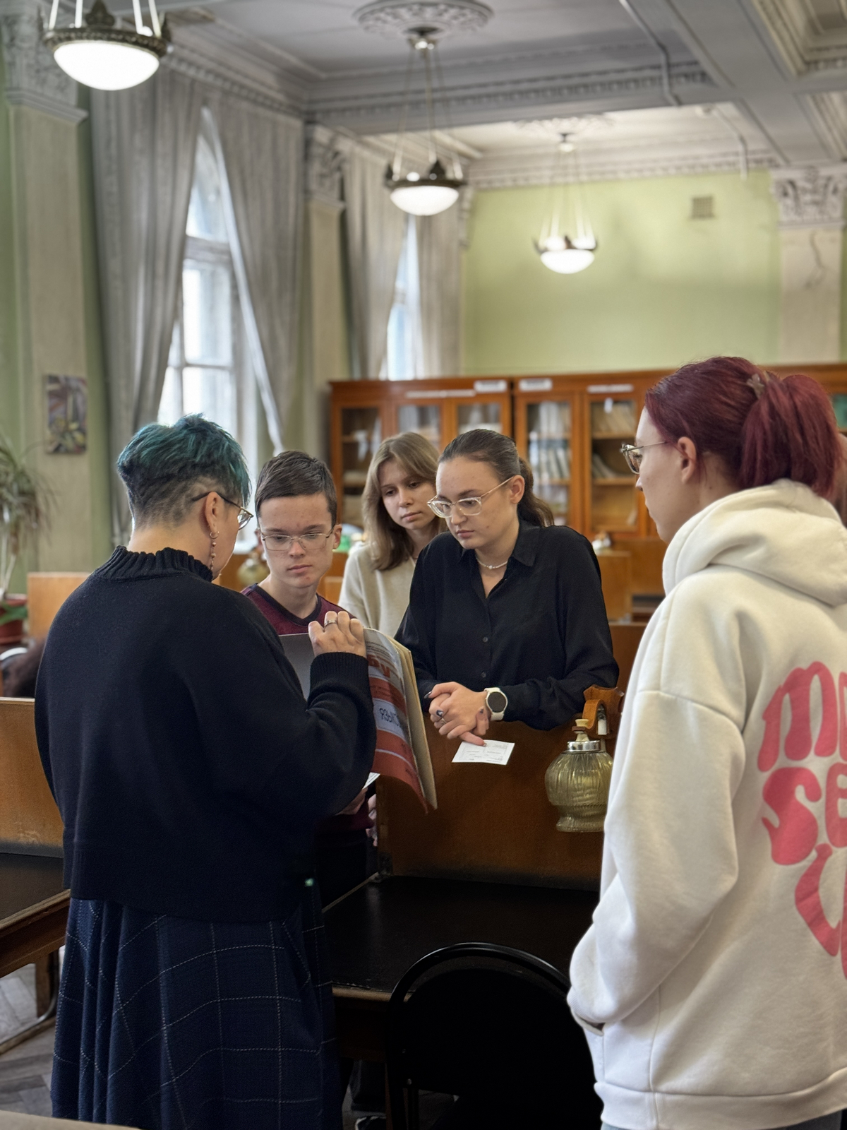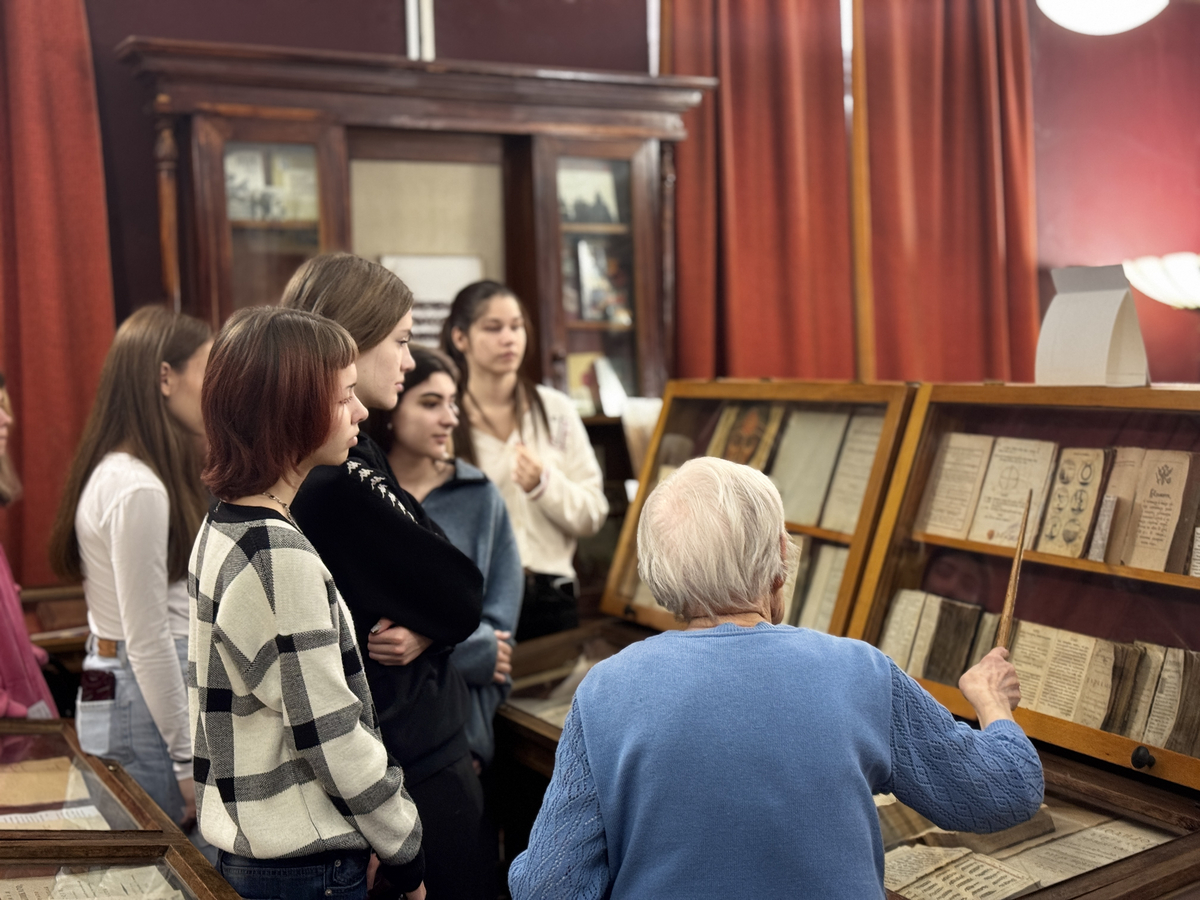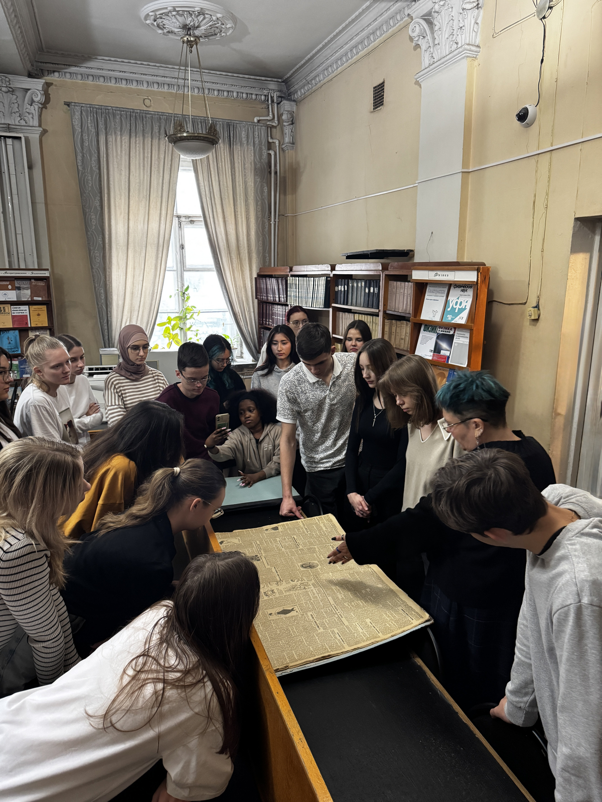 Завершилась экскурсия знакомством с отделом редких книг. Студентам рассказали об особенностях первых рукописных книг, продемонстрировали примеры разных типов письма: устава, полуустава, скорописи. Также на выставке были представлены печатные издания разных эпох. Студенты с интересом слушали экскурсоводов, изучали книги, задавали вопросы.