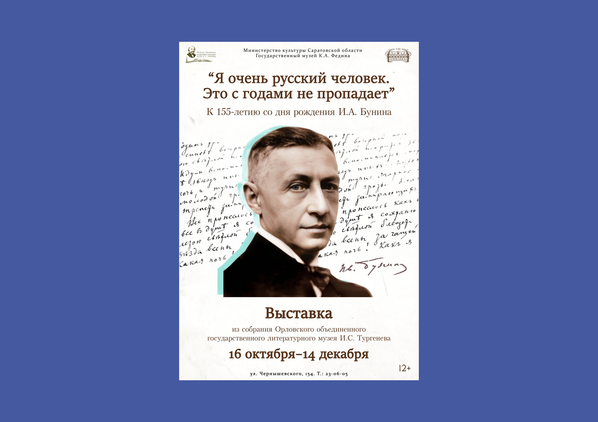 С 17 октября по 14 декабря в Государственном музее К. А. Федина будет работать выставка, посвящённая Ивану Алексеевичу Бунину «Я очень русский человек. Это с годами не пропадает» из собрания Орловского объединённого государственного литературного музея И.С. Тургенева.