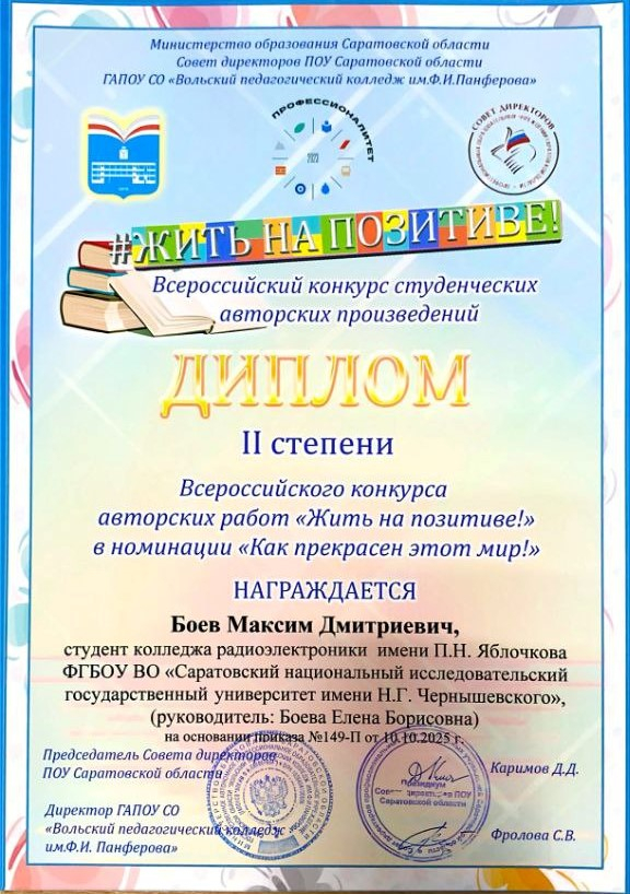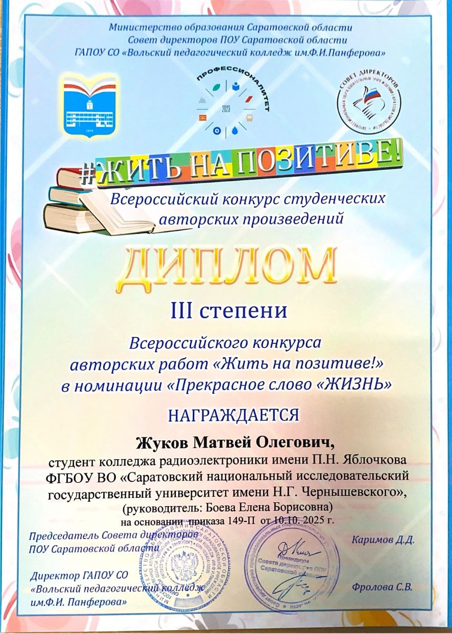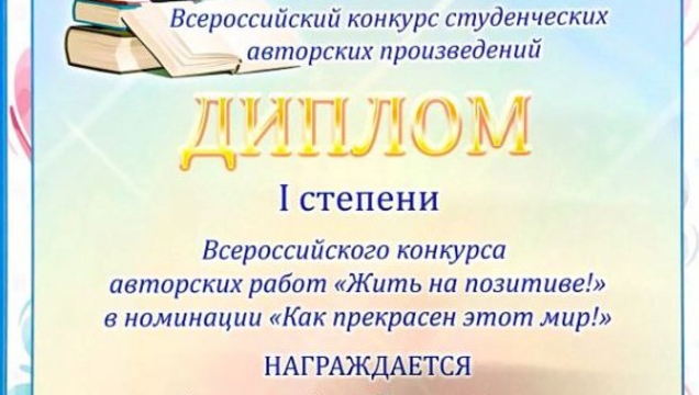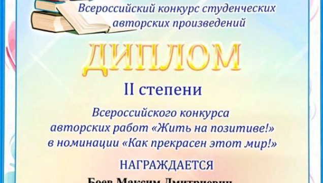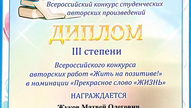 С 15 октября по 14 ноября 2025 года проходил Всероссийский конкурс студенческих авторских произведений «ЖИТЬ НА ПОЗИТИВЕ!». Целями конкурса являлись: развитие творческого потенциала талантливых обучающихся профессиональных образовательных учреждений; приобщение студентов к процессу создания уникальных текстов; формирование позитивной установки на здоровый образ жизни, умения выражать свои мысли и чувства, личное отношение к окружающему; привлечение внимания к проблемам гражданско-патриотического и духовно-нравственного воспитания; осознание значимости выбранной профессии.