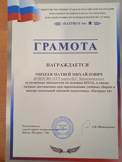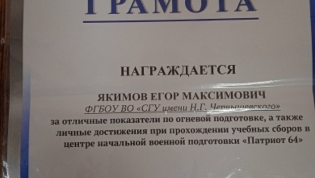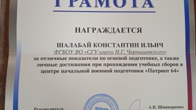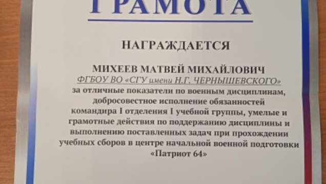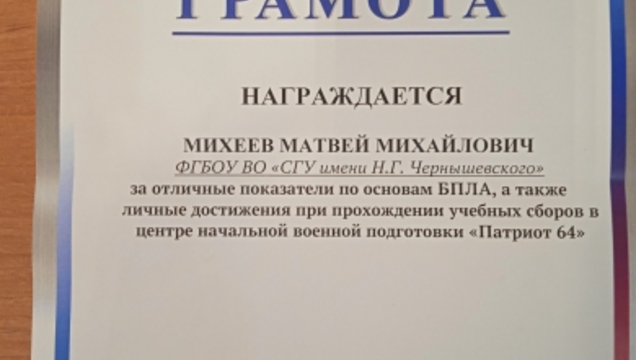 По результатам выполнения поставленных задач при прохождении учебных сборов Михеев Матвей, Мясников Константин, Якимов Егор, Шалабай Константин и Калимов Алихан награждены Грамотами за отличные показатели по военным дисциплинам, по основам БПЛА, по огневой подготовке, строевой выучке и активному участию в проведении мероприятий патриотической направленности.