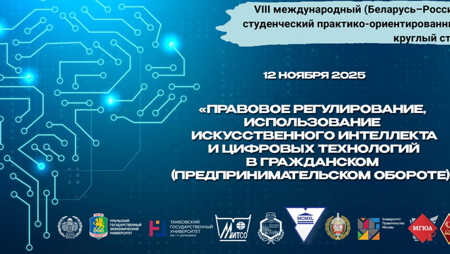 12 ноября студенты, магистранты и преподаватели кафедры гражданского права и процесса юридического факультета приняли участие в Международном (Беларусь-Россия) практико-ориентированном круглом столе"Правовое регулирование, использование искусственного интеллекта и цифровых технологий в гражданском (предпринимательском обороте)". В работе круглого стола участвовали ВУЗы Москвы, Саратова, Новосибирска, Екатеринбурга, Тамбова, Гродно (Беларусь), Минска (Беларусь), Полоцка (Беларусь).