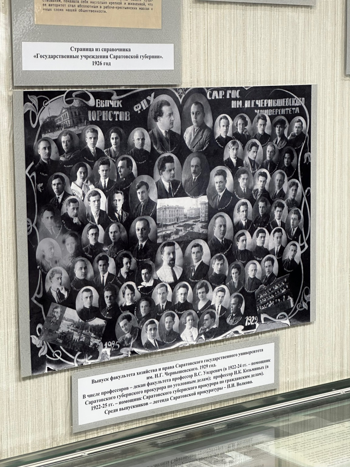 Одним из экспонатов являлась фотография профессорско-преподавательского состава и первого выпуска факультета народного хозяйства и права Саратовского государственного университета им. Н.Г. Чернышевского 1929 года, на которой запечатлены декан факультета профессор В.С. Ундревич (в 1922-1924 гг. – помощник Саратовского губернского прокурора по уголовным делам); профессор И.К. Козьминых (в 1922-1925 гг. – помощник Саратовского губернского прокурора по гражданским делам) и выпускник-легенда Саратовской прокуратуры – П.И. Волкова. Представленный экспонат, безусловно, позволил будущим юристам прикоснуться к истории юридического факультета, а также истории прокуратуры через судьбы конкретных людей, ее творивших, тем самым, сохраняя память о прошлом ради будущего.