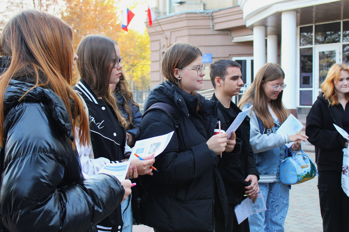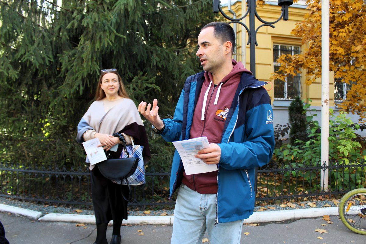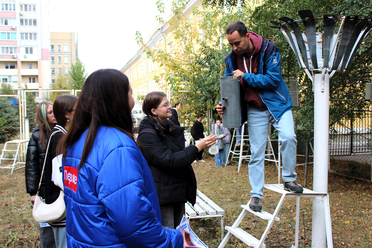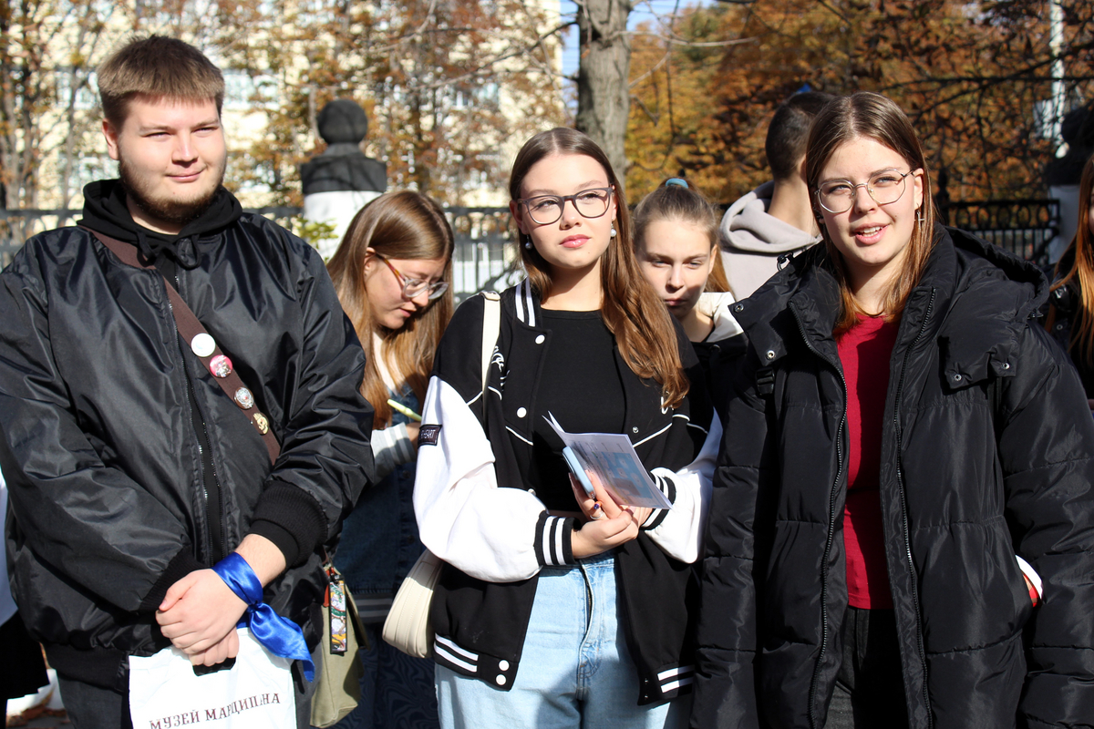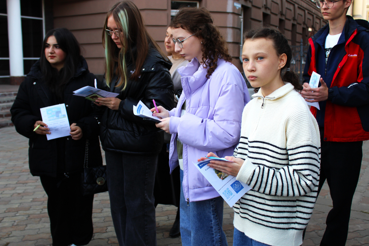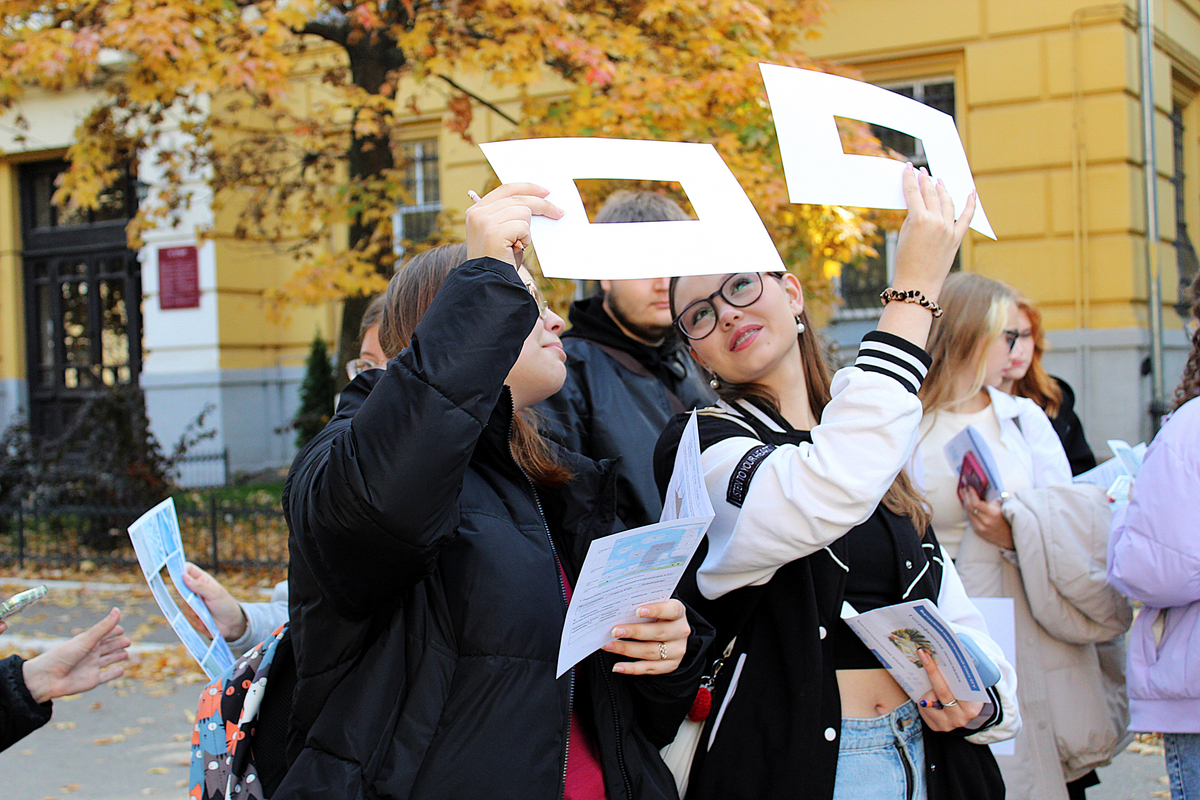 Путешествие по кампусу началось со знакомства с памятником Кириллу и Мефодию. М.Ю. Червяков вместе с волонтёрами СГУ раздал присутствующим маршрутные листы, необходимые для письменной фиксации наблюдений.