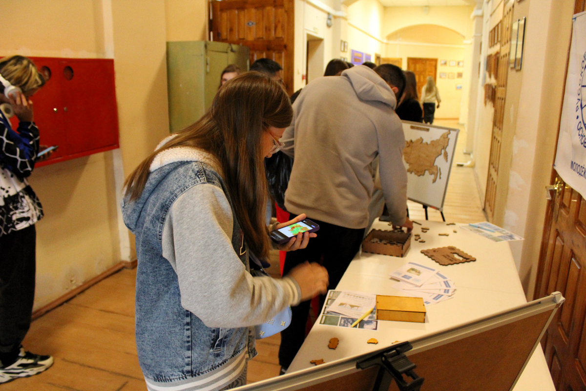 На площадке «Спилс-карты» школьники вместе со студентом географического факультета СГУ Тамерланом Жумашевым собирали пазлы из карт России и Саратовской области.