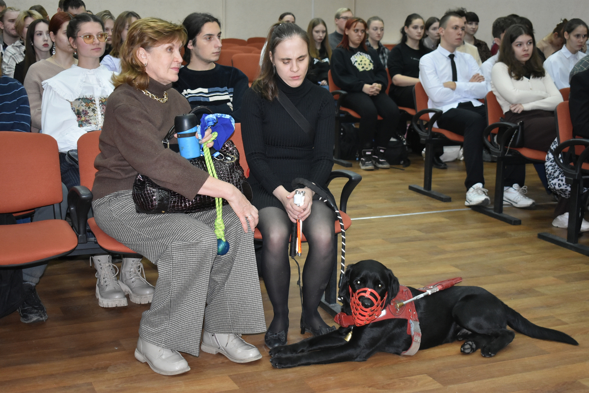 На площадке «Зрение» заведующий лабораторией инклюзивного обучения СГУ Л.В. Мясникова рассказала о правилах сопровождения незрячих людей. Выпускница СГУ Т. Зюзина с нарушениями зрения поделилась личным опытом и наглядно продемонстрировала роль собаки-проводника по кличке «Лекс» в повседневной жизни.