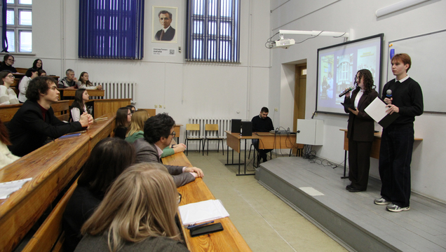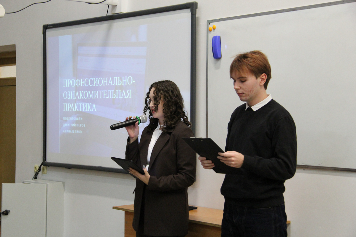 Первыми о результатах своей практики рассказали студенты 2 курса Д. Перов и А. Шейко. Они поделились впечатлениями от своей работы в Управлении медиакоммуникаций СГУ. Студенты сделали акцент на трудностях, с которыми они столкнулись, создавая журналистские материалы.