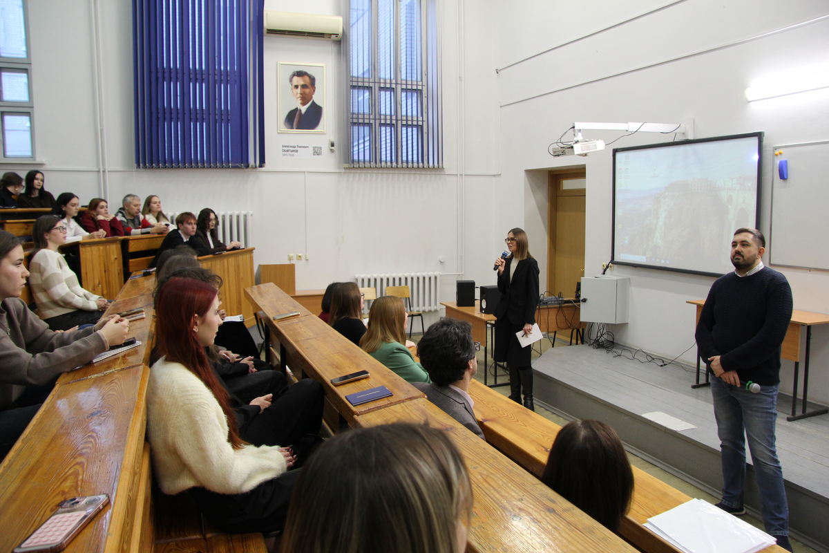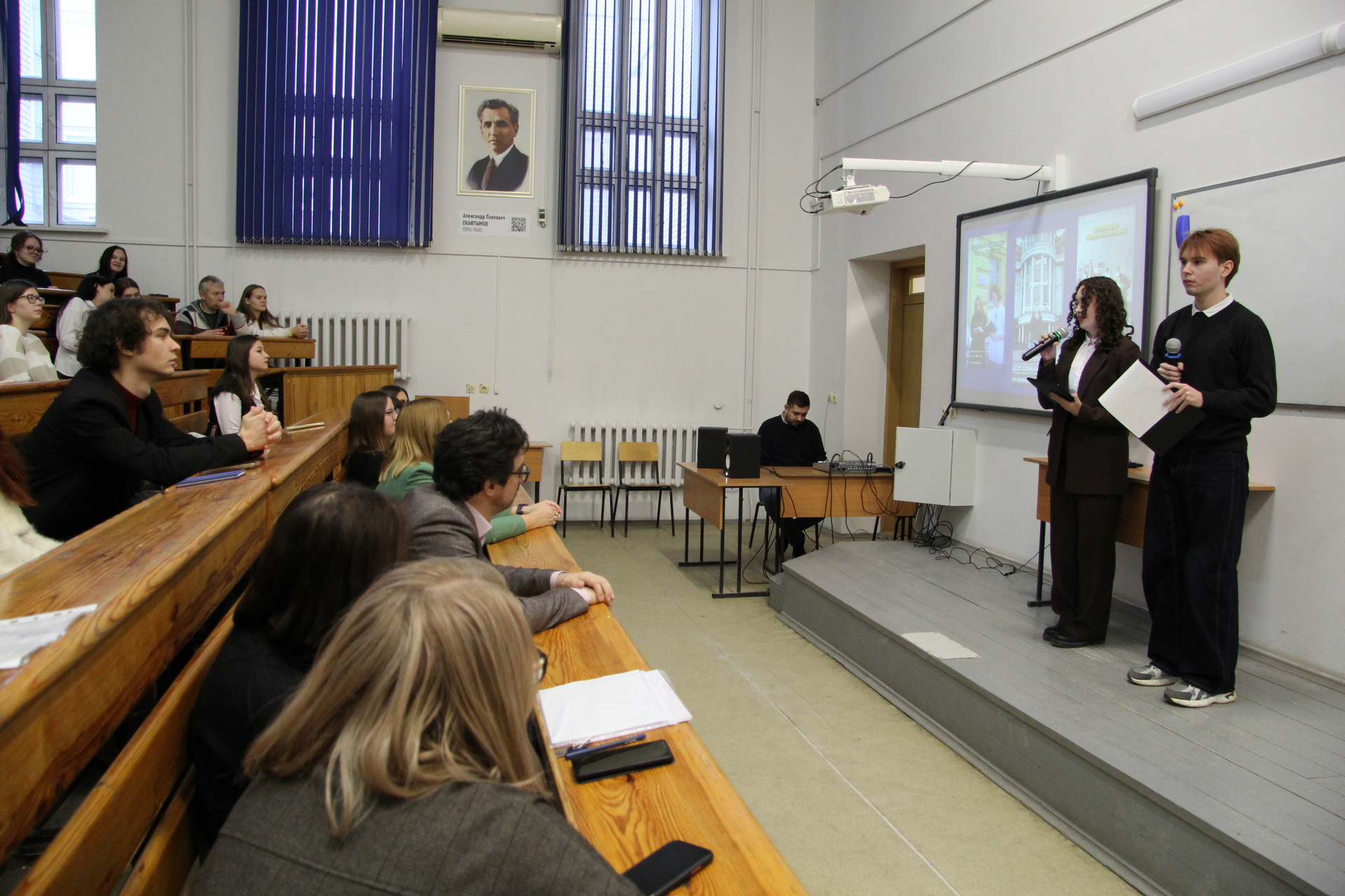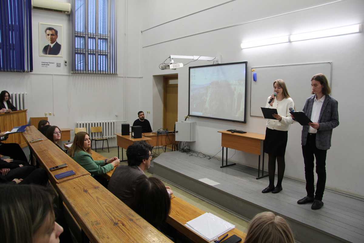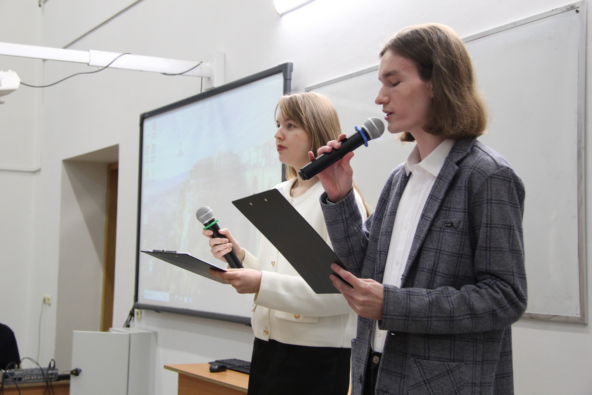 Участников встречи поприветствовали ведущие – студенты Е. Ветлина и А. Лалов. После этого к присутствующим обратились доценты кафедры общего литературоведения и журналистики Ю. Н. Аникеева и Р. И. Павленко. Они представили обзорный рассказ о практике студентов 1 и 2 курсов.