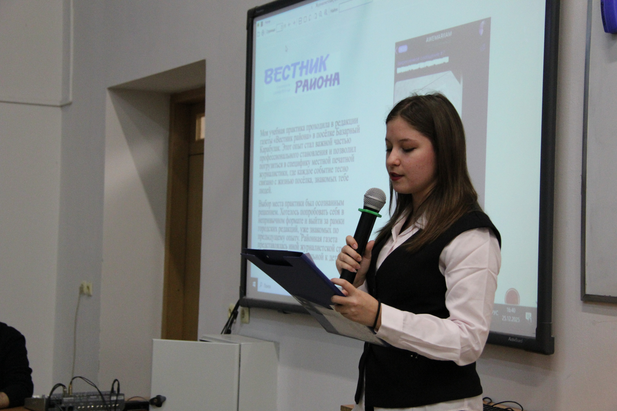 Затем свои отчёты представили студенты 4 курса. У. Паламарчук и В. Перепелова рассказали о полученном опыте на ГТРК «Саратов». Завершающим стало выступление М. Полушкиной, которая поделилась впечатлениями от практики в Базарнокарабулакской газете «Вестник района».