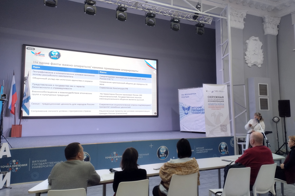 С 25 по 26 сентября 2025 года в Вятском государственном университете состоялась программа повышения квалификации «Акценты курса “Основы российской государственности” в 2025-2026 гг.» для преподавателей вузов Приволжского федерального округа. Философский факультет представила ответственная за воспитательную работу, доцент кафедры теологии и религиоведения Маргарита Владимировна Каткова.