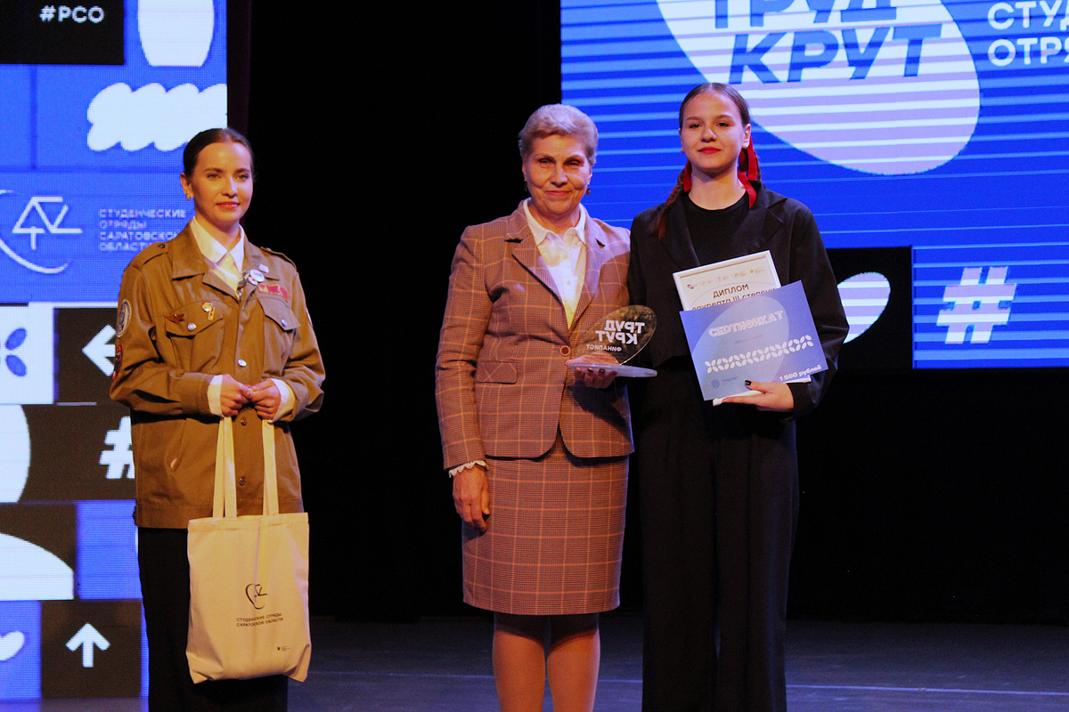 Победителем регионального конкурса вожатского и педагогического мастерства «Вдохновляй» стала студентка Саратовского областного педагогического колледжа – Преснякова Дарья, награду Дарье вручила председатель Комитета молодёжной политики А.А. Беловицкая.
